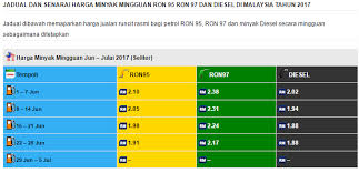 Semak harga minyak semasa malaysia terkini memandangkan harga petroleum pasaran dunia menunjukkan trend yang kian menurun menteri kewangan malaysia telah mengumumkan melalui sidang media pada 24 disember 2018 bahawa harga minyak akan diapungkan semula mengikut harga pasaran dunia secara mingguan bermula 1 januari 2019. Seterusnya bermula 7 jun 2018. Harga minyak petrol dan diesel terkini minggu ini seluruh stesen minyak di malaysia petronas shell petron caltex bhp mengikut penetapan harga kerajaan kpdnkk petrol diesel price malaysia.
