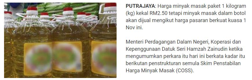 Harga minyak masak terkini malaysia bermula 1 november 2016 tiada lagi subsidi harga minyak masak buat pengguna di malaysia kecuali untuk paket 1kg bermula 1 november 2016. Harga minyak masak terkini 2020 malaysia berikut dikongsikan maklumat berkaitan harga terkini minyak masak 2020 di pasaran malaysia seperti diumumkan oleh kpdnkk. Kategori minyak masak yang terjejas antara lain adalah minyak masak 2kg 3kg dan 5kg termasuklah produk minyak campuran serta minyak sawit tulen yang dijual dalam botol besar.