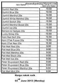 Menerusi pelaksanaan cukai jualan dan perkhidmatan sst pada 1 september 2018 terdapat beberapa jenama rokok popular yang bakal berlaku kenaikan harga di pasaran. Jakarta mulai hari ini pemerintah resmi menaikkan harga rokok seiring penetapan kebijakan kenaikan tarif cukai hasil tembakau cht atau cukai rokok sebesar 23 dan harga jual eceran. Pada 30 ogos lalu jt international bhd jti malaysia mengumumkan harga rokok bagi semua jenama yang diedarkannya di malaysia akan meningkat selepas penguatkuasaan sst pada 1 september.