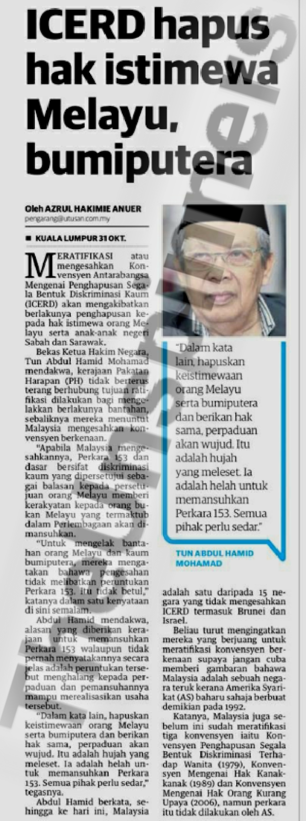 Isu berkaitan cadangan malaysia menandatangani konvensyen antarabangsa mengenai penghapusan segala bentuk diskriminasi kaum icerd hangat dibicarakan pelbagai pihak terutama yang mewakili kepentingan melayu dan bumiputera. Selain malaysia negara lain yang tidak meratifikasi icerd adalah korea utara myanmar angola bhutan brunei dan negara baru sudan selatan. Icerd sebenarnya telah diluluskan di perhimpunan agung pbb pada tahun 1965 lagi dan mula dikuatkuasakan pada tahun 1969.