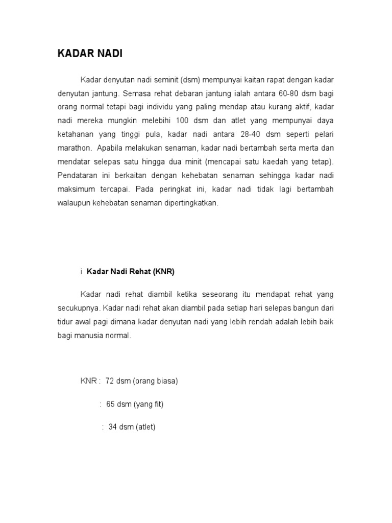 Sebagai contoh 60 dari 178 107 bpm dan jika anda berterusan senaman peratusan bagi kadar maksimum nadi sepatutnya dijadikan matlamat untuk dinaikkan. Kemudian ambil semula selepas senaman untuk melihat jika ia kembali normal dalam masa kira kira 10 minit. Dipengaruhi oleh pelbagai faktor seperti ubat ubatan keresahan kemurungan faktor hormon dan sebagainya.