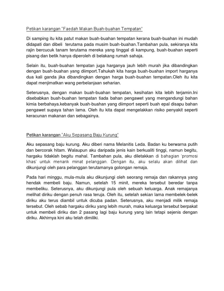 Karangan kelebihan buah buahan tempatan. Ini kerana buah tempatan juga amat kaya dengan pelbagai nutrisi dan khasiat untuk kesihatan tubuh. Pokok buah buahan ini seperti pisang dan betik boleh kita tanam sendiri di sekeliling rumah apatah lagi sekiranya kita tinggal di kampung. Di bawah dikongsikan contoh karangan kelebihan dan kebaikan buah buahan tempatan sebagai rujukan buat para pelajar.