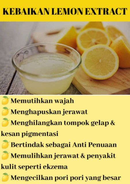 Namun ternyata tak hanya buahnya saja yang memiliki manfaat. Gunakan lemon untuk mencuci wajah menyingkirkan sel kulit mati atau masker. Dengan rutin mengkonsumsi jus lemon dan memakainya sebagai masker cara tersebut bisa membantu membuat wajahmu menjadi lebih cerah.