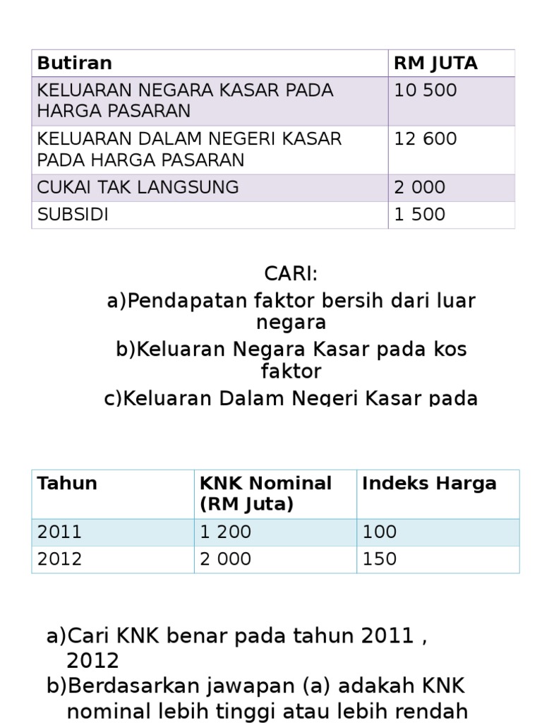 Terdapat beberapa klasifikasi utama yang perlu diambil kira dalam mengukur pertumbuhan ekonomi dengan kdnk. Keluaran negara kasar pada harga pasaran o keluaran negara kasar pada harga pasaran mengukur nilai barang dan perkhidmatan akhir yang dihasilkan oleh faktor pengeluaran milik warganegara tersebut dalam. Definisi keluaran dalam negeri kasar kdnk kdnk ialah statistik berkenaan pendapatan negara dan ianya juga berkaitan dengan pertumbuhan atau pembangunan ekonomi.