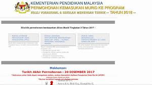 Kemasukan ke kolej vokasional 2017. Kemasukan ke kolej vokasional assalamualaikum. Permohonan kemasukan ke kolej vokasional kv dan sekolah menengah teknik smt 2017 akan dibuka secara online mulai oktober 2016 pemohon yang berkelayakan boleh memohon melalui laman sesawang kementerian pendidikan malaysia. Berdasarkan semakan berita semasa melalui pengumuman kementerian pendidikan malaysia kpm mana mana daripada anda yang berminat boleh mula daftar dan hantar permohonan kolej vokasional 2017 dan juga permohonan sekolah teknik 2017 melibatkan kemasukan ambilan januari 2017 ini.