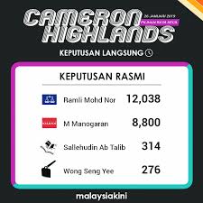 Keputusan tidak rasmi setakat 6 52pm menunjukkan calon bn ramli mohd nor memenangi prk cameron highlands selepas mendapat 11 320 undi iaitu lebih separuh dari kira kira 22 000 keluar mengundi 70 peratus. Mahkamah mendapati sivarraajh bersalah menyuap antara rm30. Pilihan raya kecil prk parlimen cameron highlands 2019 merupakan pilihan raya kecil yang kelima selepas pilihan raya umum malaysia ke 14 pilihan raya ini diadakan berikutan mahkamah pilihan raya mengisytiharkan bahawa keputusan pilihan raya bagi kerusi parlimen p 078 cameron highlands yang diadakan pada 9 mei 2018 adalah terbatal.