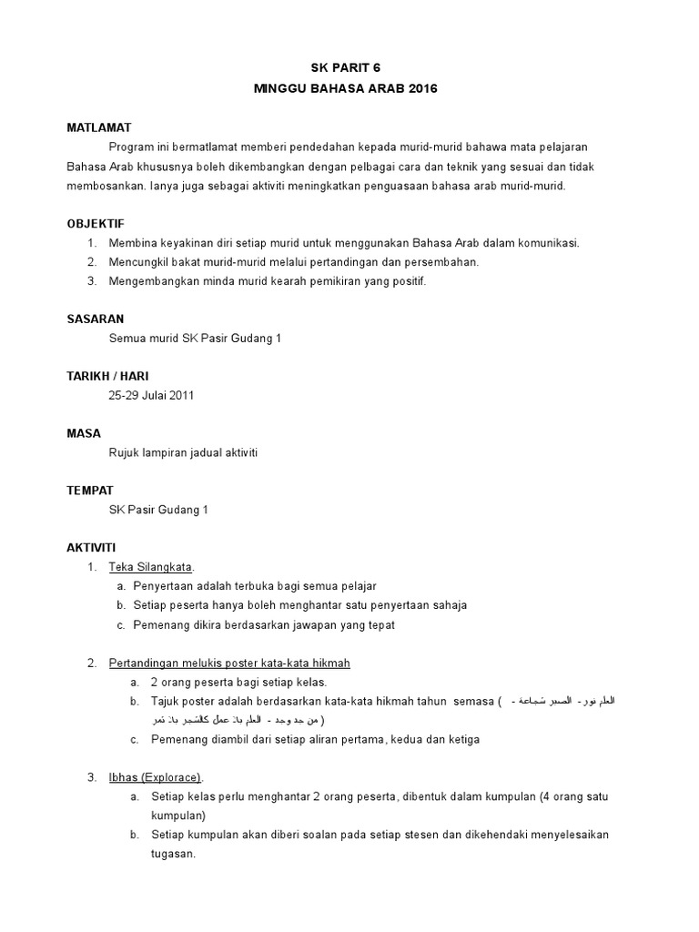 Program ini dirancang bertujuan untuk memupuk minat dan mencungkil kebolehan murid dalam meguasai bahasa arab. 10 14 februari 2020 malaysia membaca ajuran pusat sumber sekolah dengan kerjasama panitia bahasa melayu panitia bahasa inggeris panitia bahasa arab panitia pendidikan agamaislam panitia. Contoh kertas kerja.